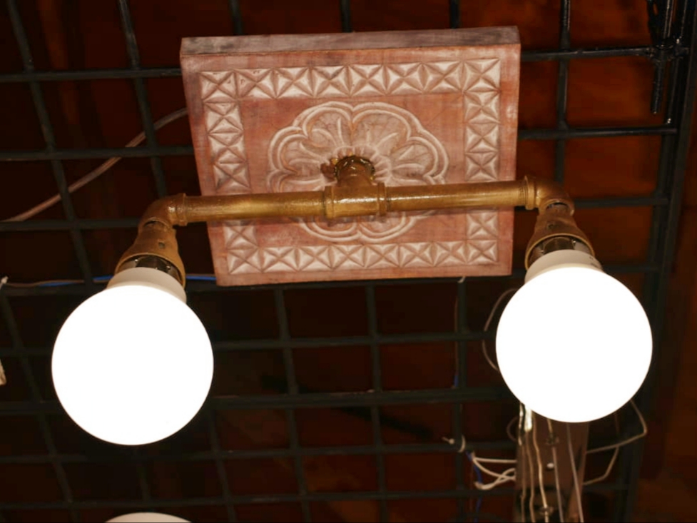 Carved wood ceiling lights.