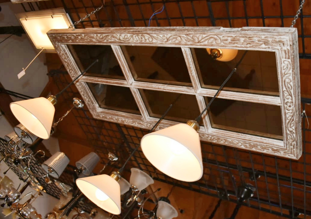 Zanzibar window with antique mirror and three drop lights.